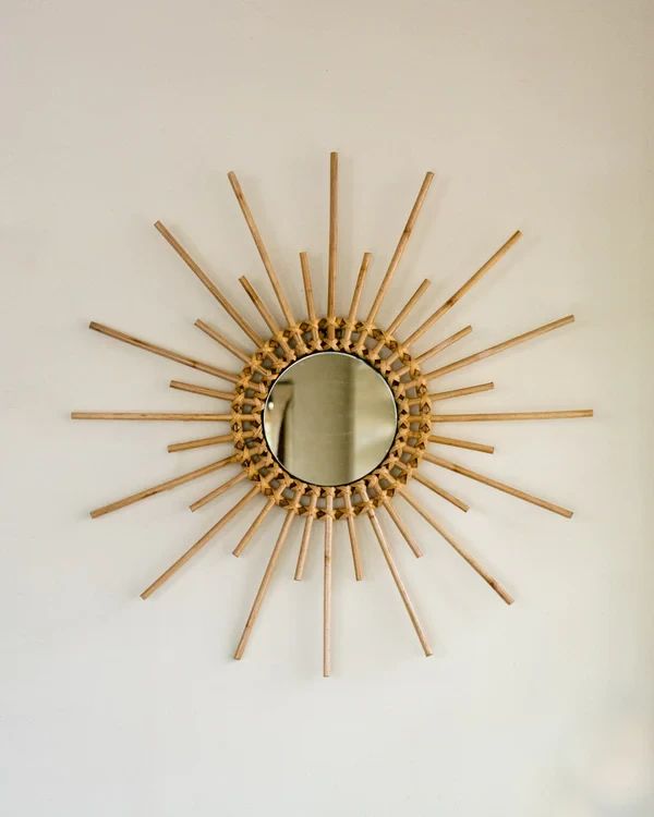 Sunshine round decorative mirror for you to achieve the perfect bohemian wall decor you've been eyeing on forever. Comes with a hook for an easy wall hanging. Made out of Rattan/Cane.